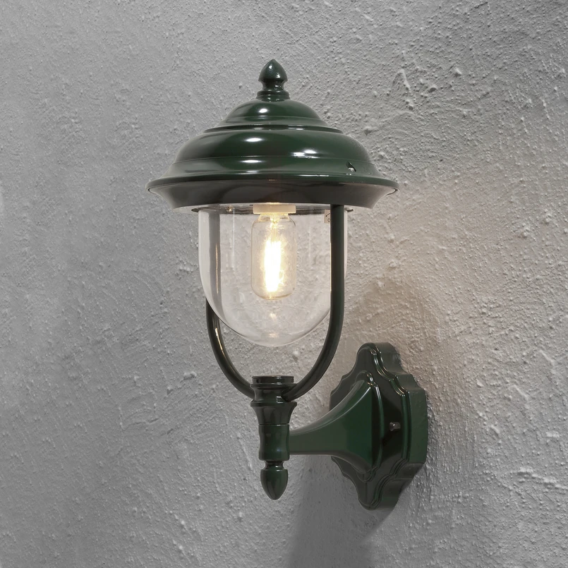 Klasyczna wykonana z aluminium stojąca zewnętrzna lampa ścienna PARMA, do wyboru w kolorze białym, zielonym lub czarnym lakierowanym matowym. Przezroczysty klosz tej lampy gwarantuje optymalne oświetlenie. Klosz o pięknym kształcie oraz zdobienia nadają tej lampie lekko nostalgiczny charakter.