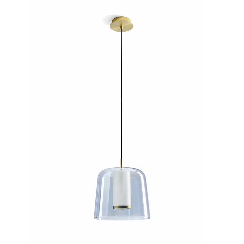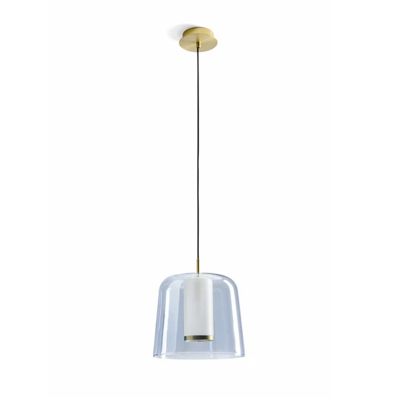 Lampa wisząca Frida z podwójnym kloszem wykonanym ze szkła i złotymi detalami Dzięki serii lamp Frida włoski projektant i architekt Davide Negri zaprojektował ponadczasowe dozowniki światła o wyjątkowej elegancji. Lampa wisząca ma klosz w kształcie ściętego stożka wykonany z subtelnie przyciemnianego, przezroczystego szkła borokrzemowego, który jest pociągnięty w dół. Wewnątrz znajduje się znacznie mniejszy cylinder wykonany z piaskowanego szkła borokrzemowego, który otacza oprawkę G9. Detale o wyglądzie szczotkowanego złota na wewnętrznym cylindrze i czaszy dopełniają lampę wiszącą Frida.
