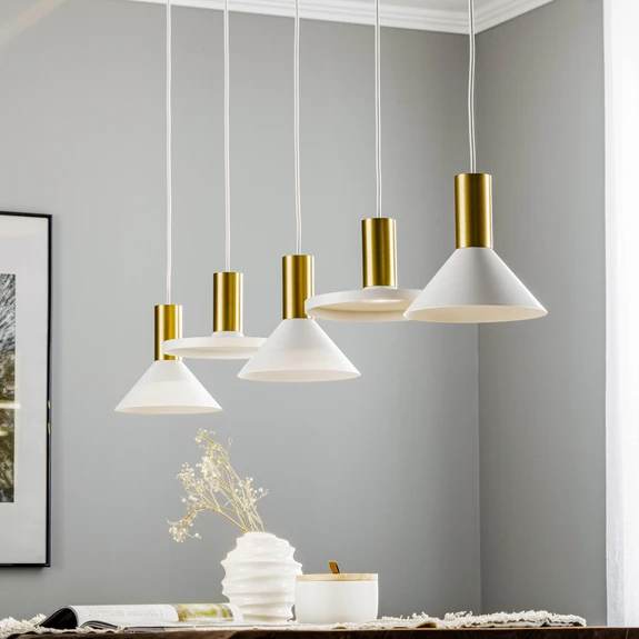 Żyrandol Hermanos V 5-punktowa w kolorze białym i mosiężnym łączy w sobie nowoczesny design z wysokiej jakości wykonaniem ze stali i mosiądzu. Ta wyprodukowana w Europie lampa zachwyca elegancką kolorystyką i idealnie pasuje do różnych pomieszczeń mieszkalnych, takich jak salon, kuchnia lub jadalnia. Połączenie bieli i mosiądzu nadaje lampie ponadczasową estetykę, która stanowi akcent zarówno w nowoczesnych, jak i klasycznych wnętrzach.