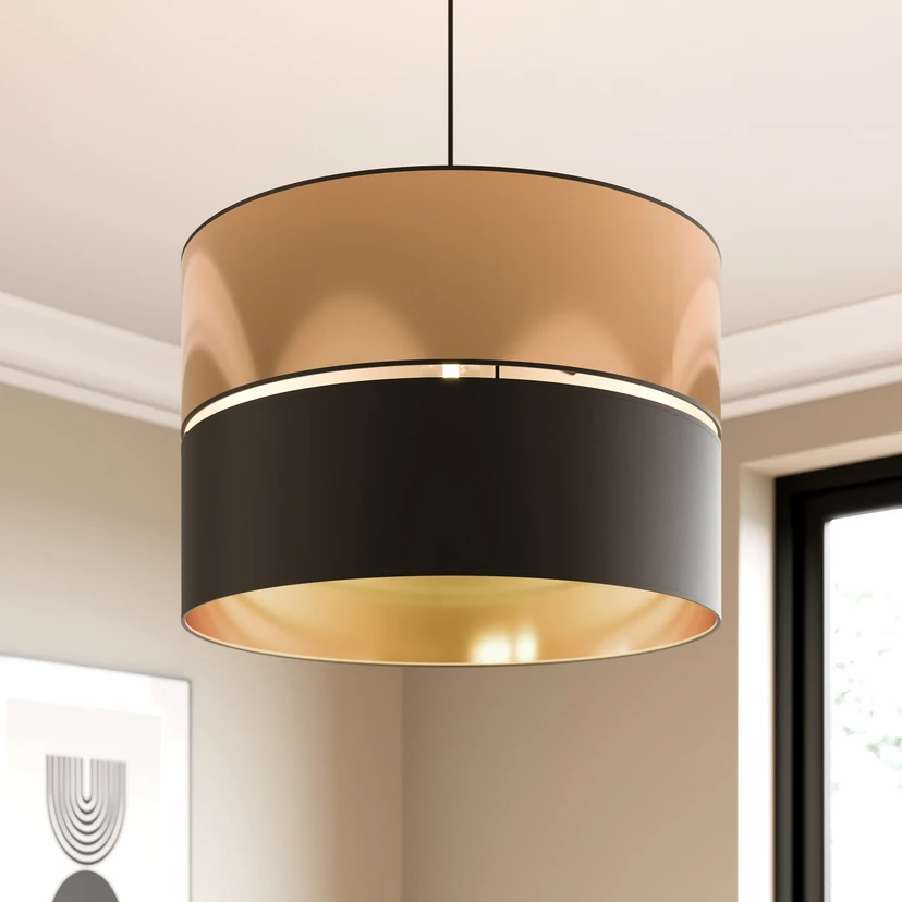 Żyrandol Hilton w kolorze czarnym i złotym łączy w sobie nowoczesny design z wysokiej jakości materiałami, takimi jak tkanina i metal. Ta 1-punktowa lampa stanowi stylowy akcent w pomieszczeniach mieszkalnych, takich jak salon, kuchnia lub jadalnia. Elegancka kolorystyka w czerni i złocie nadaje każdemu pomieszczeniu luksusowy charakter i zapewnia przyjemną atmosferę.