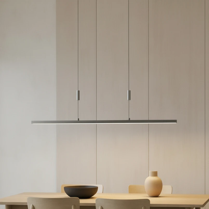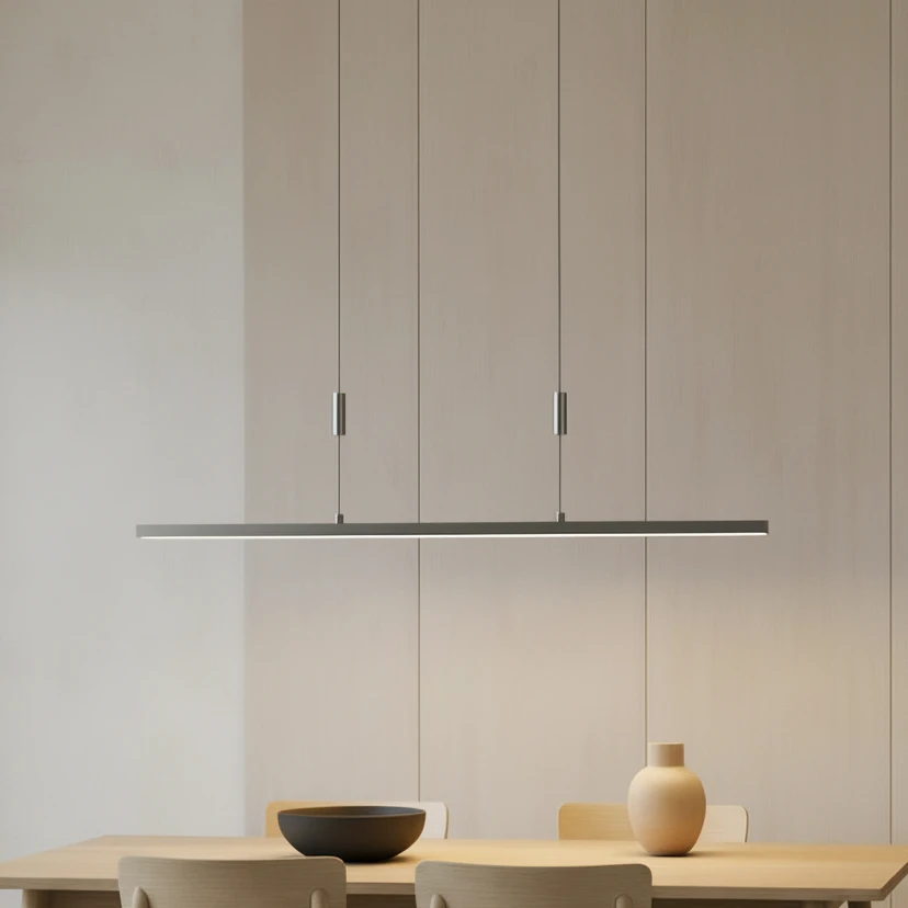 Wąska lampa wisząca LED Myron w formie belki z nowoczesną powierzchnią z aluminium, regulowaną barwą światła i ściemniaczem dotykowym Może nie jest to oczywiste na pierwszy rzut oka, ale Myron to lampa wisząca, która posiada wiele bardzo przydatnych cech. Najbardziej oczywistą cechą jest prawdopodobnie możliwość regulacji wysokości, ponieważ dwa elementy napinające kabel w zawieszeniu są wyraźnie widoczne. Za ich pomocą można regulować wysokość w zakresie od 110 cm do 210 cm. Na lampie znajduje się również dotykowy ściemniacz, dzięki czemu można płynnie regulować jasność i ustawić zarówno jasne światło do pracy, jak i przyciemnione do romantycznych kolacji przy świecach. Biorąc pod uwagę tę opcję, świetną funkcją jest również możliwość trzystopniowej regulacji barwy światła: uniwersalna biel lub światło dzienne do pracy i ciepłe białe światło na przytulniejsze pory dnia. Jeśli oprawa była wyłączona przez dłuższy czas, zawsze włącza się z ciepłym białym światłem i pełną jasnością. Pod względem wizualnym lampa wisząca belka z wydajnymi diodami LED zdobywa punkty dzięki smukłej, niemal wdzięcznej konstrukcji o kątowym kształcie, podczas gdy powierzchnia jest utrzymana w chłodnym, eleganckim kolorze aluminium.