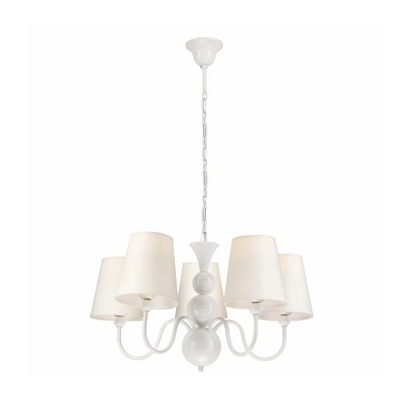 Żyrandol Mary z pięcioma kloszami łączy w sobie ponadczasową elegancję i wysokiej jakości materiały. Wykonany z wytrzymałej stali i szlachetnego materiału, emanuje klasycznym wdziękiem, który tworzy stylową atmosferę zarówno w salonie, jak i jadalni. Biały kolor kloszy zapewnia harmonijny rozkład światła, które wypełnia każde pomieszczenie przyjemnym blaskiem.