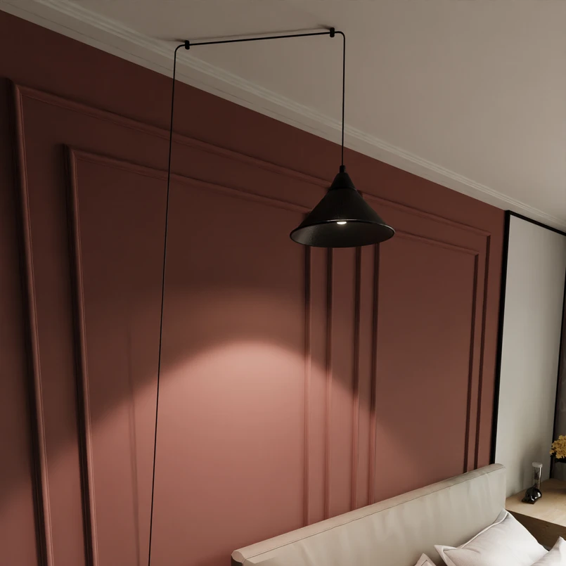 Lampa wisząca Ramo z wtyczką, zmienne mocowanieLampa wisząca Ramo składa się z okrągłego uchwytu, który można zamontować na ścianie lub na suficie. Z uchwytu biegnie kabel, który jest przymocowany do sufitu za pomocą dwóch zacisków. Kabel ten kończy się kompaktowym kloszem, w którym jest miejsce na żarówkę E27 (patrz akcesoria). Do podłączenia przez gniazdo i z włącznikiem na kablu.