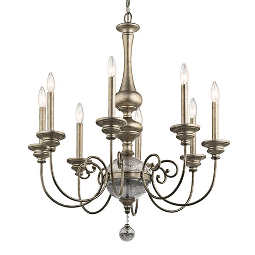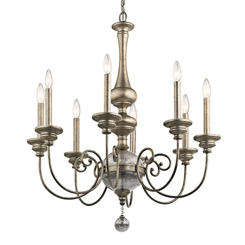 Ośmiopłomienny żyrandol Rosalie wydaje się lekki i niemalże filigranowy dzięki odważnej stylistyce Williamsburga. Odcień wykończenia nazywa się Sterling Gold, ponieważ zawiera on odcienie srebra i złota. Daje to żyrandolowi Rosalie bardzo uroczysty wygląd. Te dwa elementy dekoracyjne są również bardzo estetyczne: W środku znajduje się element szklany wykonany z antycznego szkła Merkurego, a z góry żyrandola wisi dekoracyjny wisior wykonany z tego samego szkła.